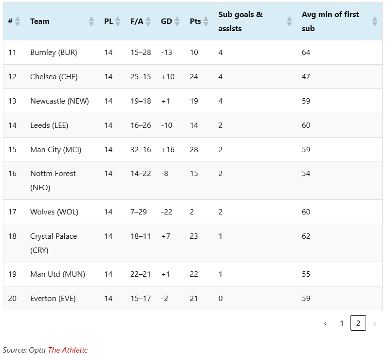 Những dữ liệu được The Athletic công bố mới đây thực sự phác họa sự tụt dốc đáng lo ngại của Quỷ đỏ mùa này và nó đặc biệt thể hiện rõ qua hiệu quả thay người, một trong những điểm từng làm nên thương hiệu của đội bóng. Theo thống kê từ Opta thông qua The Athletic, Man Utd là đội có đóng góp từ cầu thủ dự bị thuộc nhóm tệ nhất Premier League, đứng hạng 19/20 về chỉ số tác động của các cầu thủ vào sân từ băng ghế dự bị.