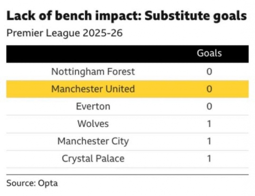 Bảng xếp hạng tác động của cầu thủ dự bị (trích The Athletic – Opta) cho thấy khoảng cách lớn giữa Man Utd và các đội bóng có chiều sâu tốt như Brighton, Aston Villa hay Sunderland, những đội sở hữu từ 7 đến 13 đóng góp trực tiếp (bàn thắng + kiến tạo) từ cầu thủ thay người. Trong khi đó, Man Utd chỉ có… 1.