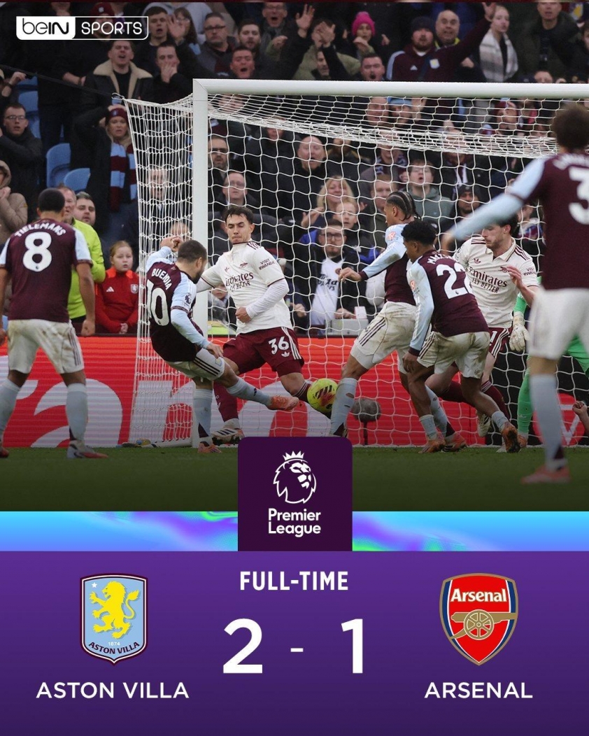 Không ngoài dự đoán của nhiều chuyên gia, đoàn quân đang bị sứt mẻ bởi chấn thương của Mikel Arteta đã gặp quá nhiều khó khăn tại Villa Park. Bị thủng lưới cuối hiệp 1 từ pha dứt điểm xâu kim thủ môn của Matty Cash. Arsenal đưa ra vài sự điều chỉnh và có được bàn gỡ hoà đầu hiệp 2 nhờ công của Trossard. Nhưng tình huống hỗn loạn cuối trận đấu đã khiến họ nhận thất bại thứ 2 tại Ngoại Hạng Anh sau bàn thắng muộn của Buendia. Arsenal vẫn giữ ngôi đầu với 33 điểm, Nhưng khoảng cách với đội bám đuổi là Man City chỉ còn 2 điểm.