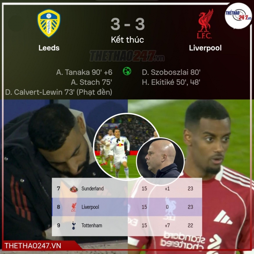 Hàng công trăm triệu Bảng của The Kop phải chờ đến đầu hiệp hai mới có thể xuyên thủng được hàng thủ của Leeds United. Hugo Ekitike mở điểm vào phút thứ 48, và hoàn thành cú đúp của riêng mình chỉ 2 phút sau đó. Những tưởng đã là một chiến thắng dễ cho Liverpool nhưng Leeds bất ngờ có bàn gỡ 1-2 trên chấm 11m của Calvert-Lewin vào phút thứ 73. 2 phút sau, Stach gỡ hoà 2-2 cho đoàn quân của HLV Daniel Farke. Dominic Szobozslai ghi bàn phút 80 đưa Liverpool vươn lên dẫn 3-2, nhưng đội bóng áo đỏ vẫn chấp nhận chia điểm khi để Tanaka ghi bàn gỡ 3-3 vào phút 90+6. Đây đã là trận thứ 4 để mất điểm của Liverpool trong 5 vòng đấu gần đây, khiến đội bóng áo đỏ chỉ đang có vị trí thứ 10 trên BXH và gần như đã hết cơ hội đua vô địch.