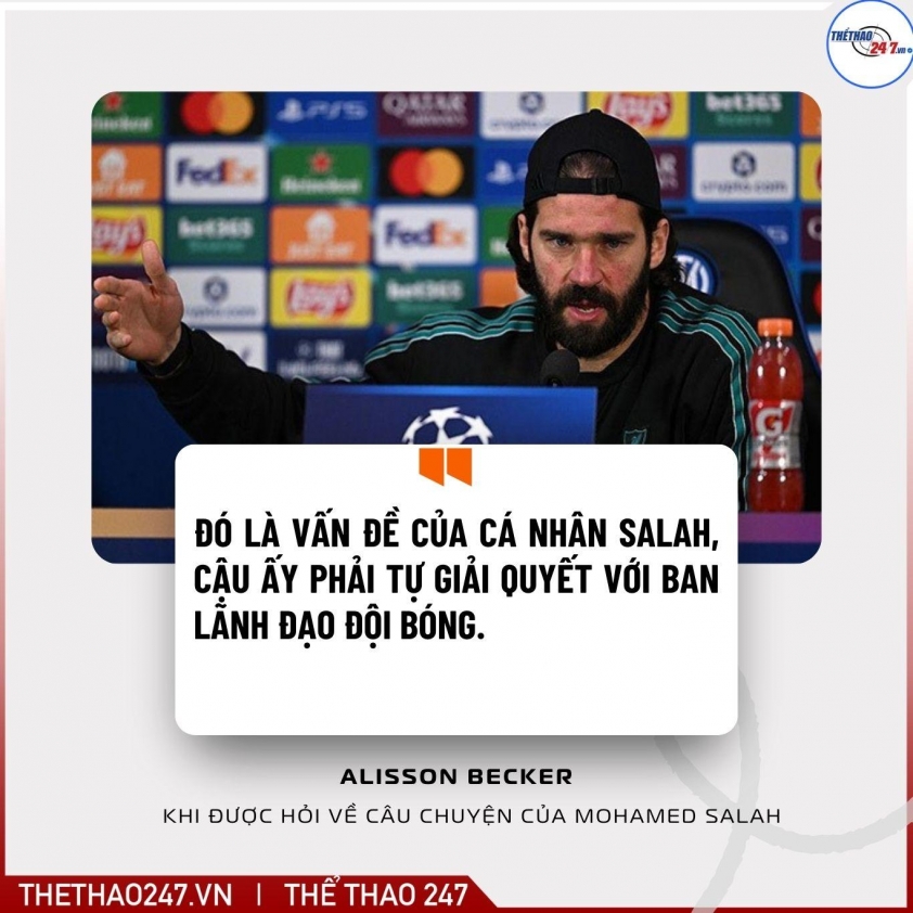 Tuy nhiên, thủ môn người Brazil cho rằng đây là vấn đề mang tính cá nhân, và anh cùng các đồng đội phải để Salah tự giải quyết với ban lãnh đạo đội bóng. "Bạn có thể kỳ vọng rằng Liverpool sẽ ra sân với tinh thần muốn chứng tỏ khát khao chiến thắng và cải thiện tình hình hiện tại. Chúng tôi sẽ chơi thứ bóng đá đẹp mắt và hiệu quả để hướng đến những chiến thắng".- thủ thành người Brazil chia sẻ thêm.