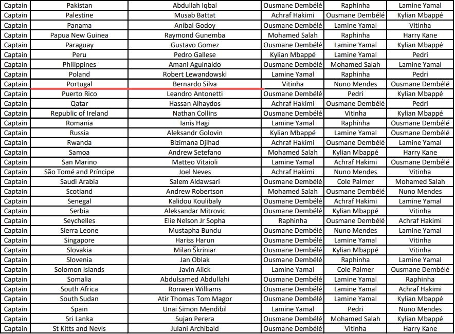 Theo dữ liệu bỏ phiếu của các đội trưởng đội tuyển quốc gia (được đánh dấu đỏ), đội trưởng Bồ Đào Nha hiện tại là Bernardo Silva (Man City), và anh ấy đã bỏ phiếu cho đồng đội người Bồ Vitinha (Paris Saint-Germain). Việc Bernardo Silva chọn Vitinha không có gì đáng ngạc nhiên vì họ là đồng đội ở đội tuyển quốc gia Bồ Đào Nha và cũng cùng là thành viên của đội ba lần vô địch mùa trước tại PSG.