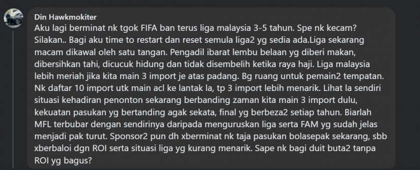 “Tôi thậm chí còn muốn thấy FIFA cấm thẳng giải VĐQG Malaysia từ 3 đến 5 năm. Ai muốn chỉ trích cứ việc. Với tôi, đây là lúc cần khởi động lại và tái cấu trúc toàn bộ các giải đấu hiện có. Giải quốc nội bây giờ giống như bị kiểm soát bởi một bàn tay duy nhất. Trọng tài thì chẳng khác nào gia súc bị nuôi sẵn, cho ăn, dọn phân, xỏ mũi và tuyệt đối không bao giờ bị ‘xử’ vào dịp lễ.