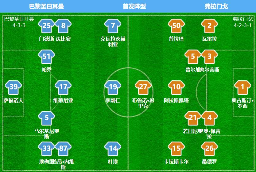 Paris đối đầu Flamengo,Enrique sử dụng sơ đồ 4-3-3, tiền vệ Hàn Quốc Lee Kang-in đá trung phong, hai cánh là Kvaratskhelia và Due, João Neves và Vitinha cùng Fabian tạo thành bộ ba tiền vệ, Emery chơi hậu vệ phải, cùng Marquinhos, Pacho và Mendes tạo thành hàng thủ bốn người, Safonov bắt chính, tổng giá trị đội hình xuất phát 700 triệu euro, độ tuổi trung bình 24,2 tuổi.Felipe Luis bố trí đội hình 4-2-3-1, tổng giá trị đội hình xuất phát chỉ 80,5 triệu euro, chưa đến 100 triệu euro, độ tuổi trung bình 30,5 tuổi, cựu cầu thủ Chelsea Jorginho ra sân ngay từ đầu.