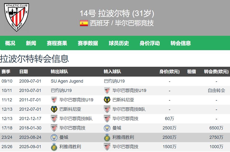 Theo thông tin từ Transfermarkt, Laporte đã chuyển từ Man City sang Al-Nassr vào kỳ chuyển nhượng mùa hè 2023 với mức phí 27,5 triệu euro, sau 2 năm, tức kỳ chuyển nhượng mùa hè 2025, anh chuyển sang Athletic Bilbao với phí 10 triệu euro.