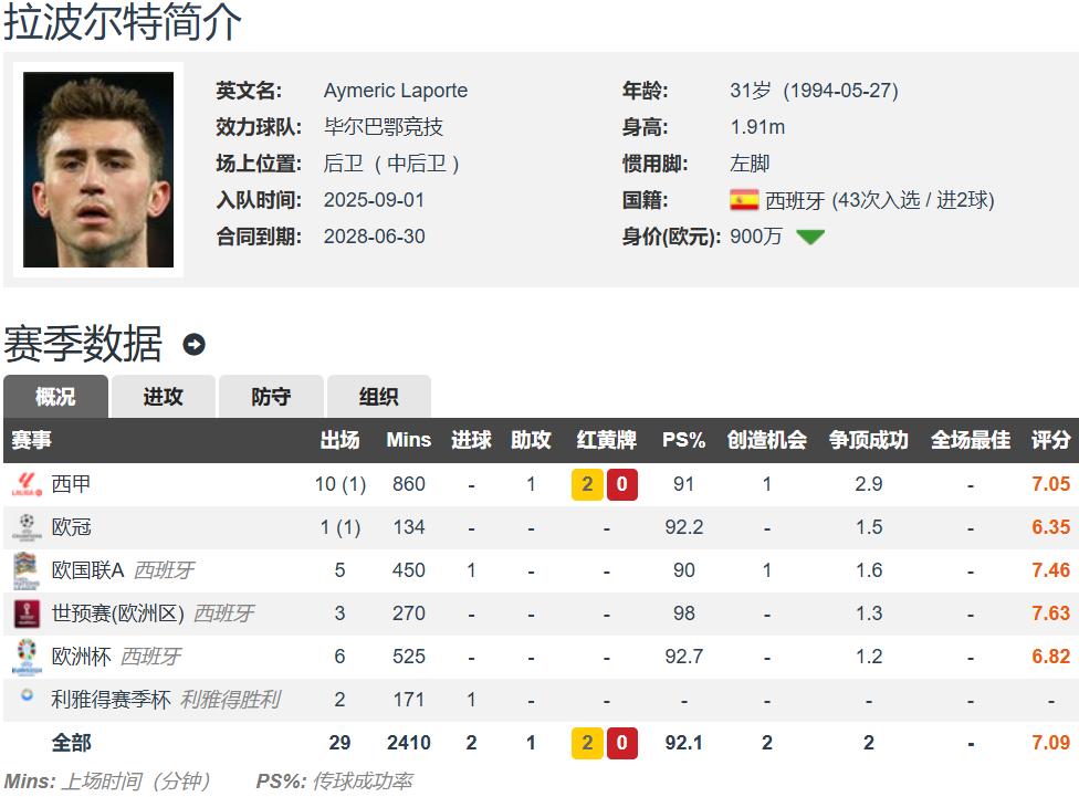 Laporte hiện 31 tuổi, cao 1,91 mét, chơi vị trí trung vệ thuận chân trái, hợp đồng với Athletic Bilbao kéo dài đến năm 2028, theo Transfermarkt định giá 9 triệu euro, mùa này đã ra sân 11 trận La Liga, có 1 pha kiến tạo, và thi đấu 2 trận Champions League.