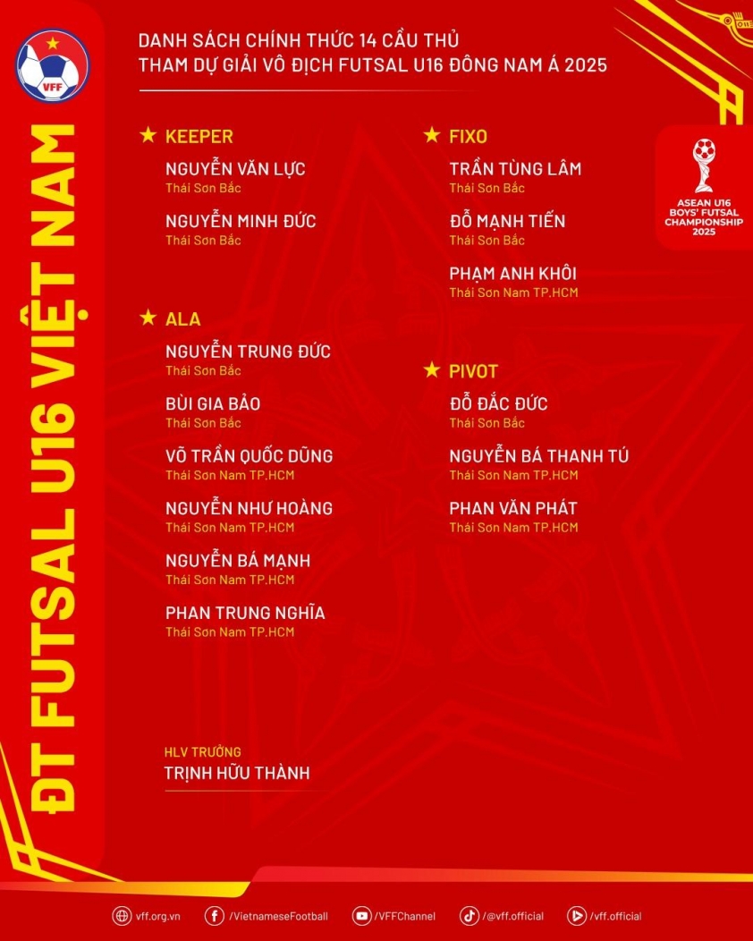 Danh sách chính thức 14 cầu thủ đội tuyển futsal U16 Việt Nam tham dự Giải vô địch futsal U16 Đông Nam Á 2025 vừa mới được công bố. So với danh sách triệu tập ban đầu, đã có 6 cầu thủ bị loại trước khi lên đường sang Thái Lan dự giải.