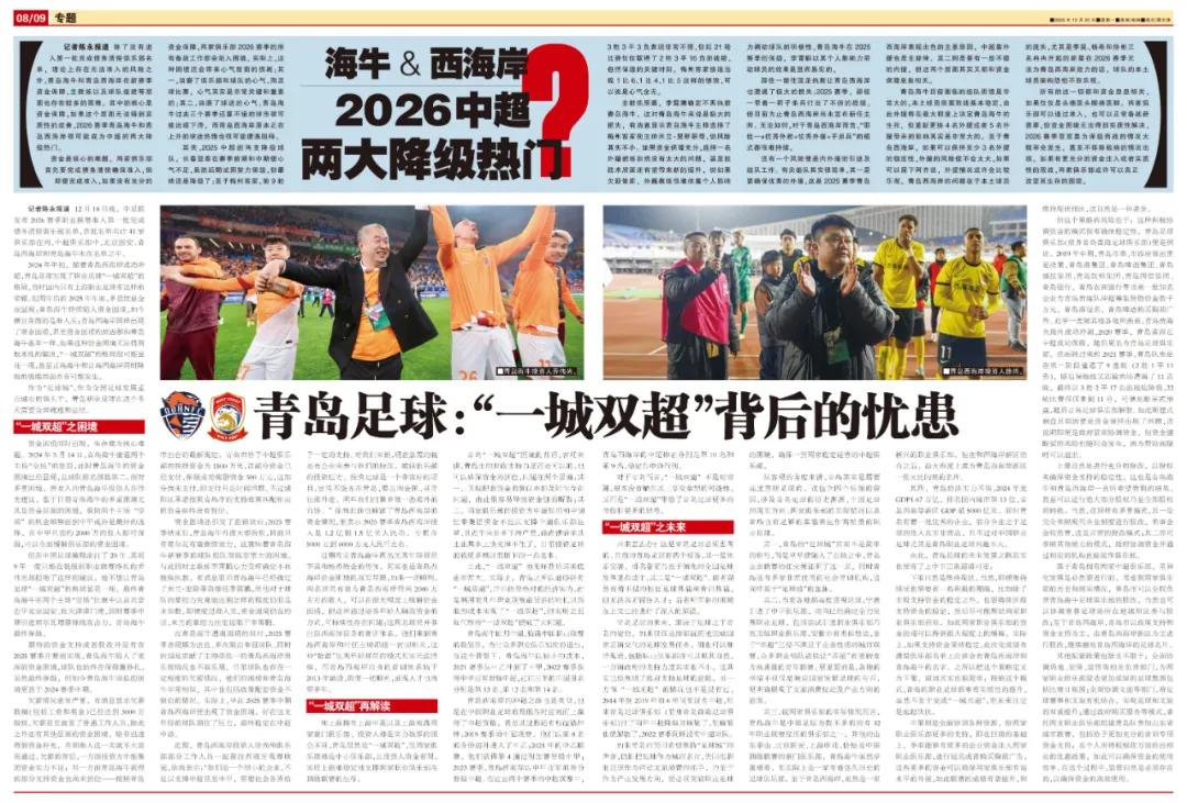 Đầu năm 2024, cùng với việc Bờ Tây Hải Tây Thanh Đảo thành công thăng hạng, bóng đá Thanh Đảo đã đạt được mô hình "một thành phố hai đội bóng siêu hạng", khi đó trong nước chỉ có bóng đá chuyên nghiệp Thượng Hải được vinh dự này. Nhưng đến cuối năm 2025, nhiều vấn đề nghiêm trọng đã hiện rõ: Bò biển Thanh Đảo tiếp tục rơi vào khó khăn tài chính, hiện đang đứng trước rào cản kiểm duyệt; Bờ Tây Hải Tây cũng gặp khó khăn về tài chính, nguyên nhân gần như giống với Bò biển Thanh Đảo. Nếu khó khăn tài chính không được giải quyết căn bản, mô hình "một thành phố hai đội bóng siêu hạng" rất có thể chỉ là nhất thời, thậm chí có thể xảy ra tình trạng cả Bò biển Thanh Đảo và Bờ Tây Hải Tây cùng xuống hạng.