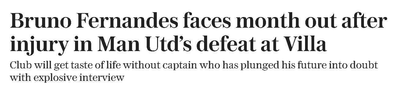 Trong trận đấu với Villa, B费 chưa kết thúc hiệp một đã ôm lấy phía sau đùi phải, khi trở lại ghế dự bị bước đi chậm chạp, đi khập khiễng, rõ ràng rất đau đớn. HLV Rúben Amorim xác nhận anh bị tổn thương mô mềm, đồng đội Diogo Dalot ngụ ý nếu không nghiêm trọng, B费 sẽ không đồng ý rời sân, sự vắng mặt của anh là tổn thất lớn.