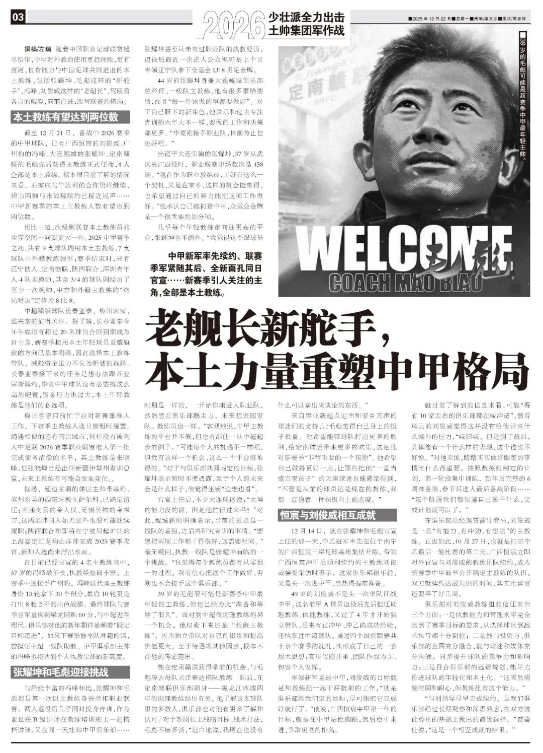 Tính đến ngày 21 tháng 12, các đội bóng chuẩn bị cho mùa giải 2026 của giải Hạng Nhất đã có Lưu Tuấn Vĩ của Quảng Tây Hằng Thần, Phùng Phong của Quảng Châu Báo, Trương Diệu Khôn của Đại Liên Côn Thành, Mao Biểu của Định Nam Cám Liên lần lượt được bổ nhiệm làm HLV trưởng chính thức, cả 4 đều là HLV nội địa. Theo thông tin hiện tại, hợp tác giữa Thạch Gia Trang và Nghiêu Hồng Lợi vẫn tiếp tục, Phật Sơn Nam Sư cũng gần hoàn tất việc gia hạn với Trương Hiệu Thụy... Số lượng HLV trưởng nội địa ở mùa giải mới của giải Hạng Nhất có thể đạt con số hai chữ số.