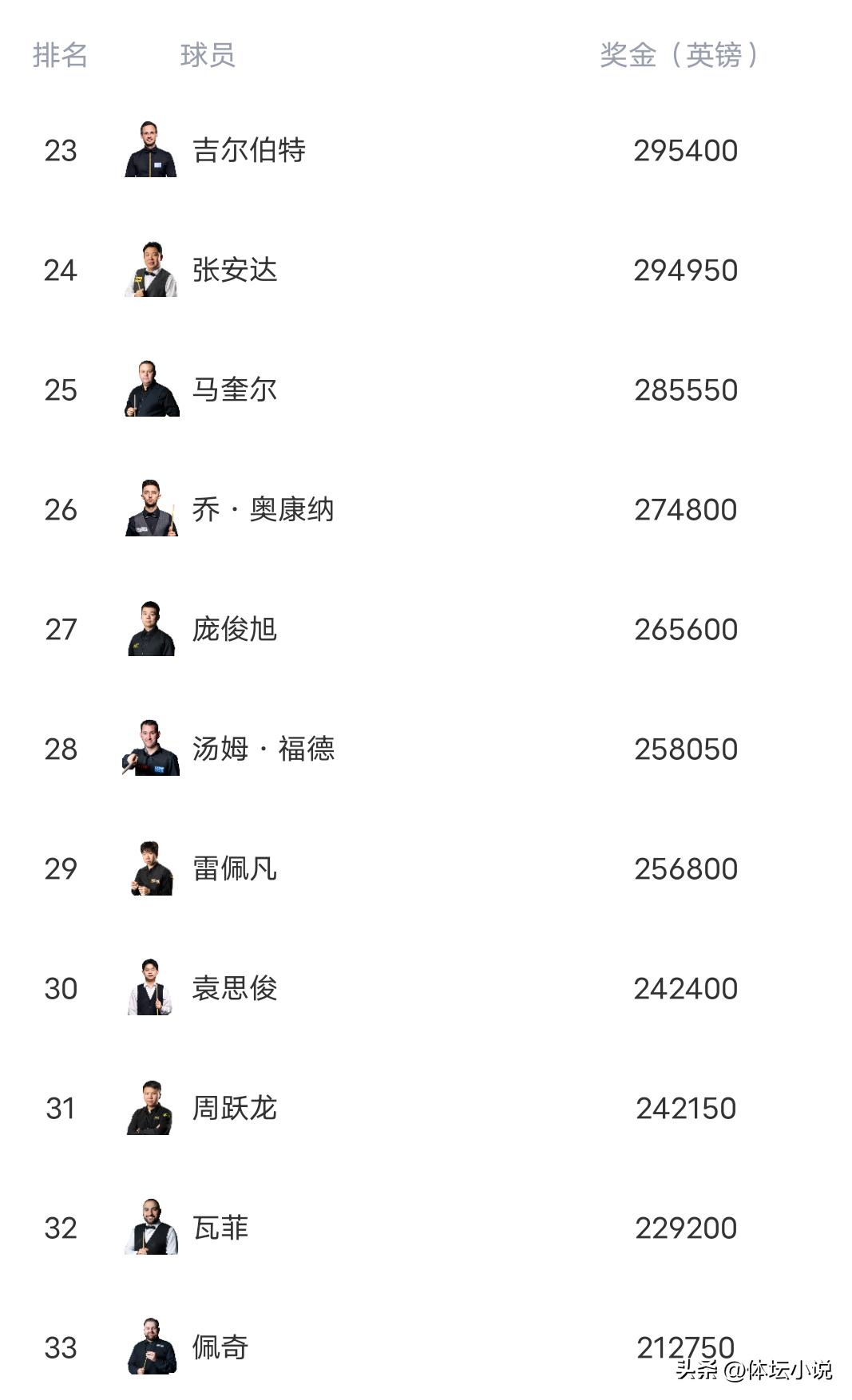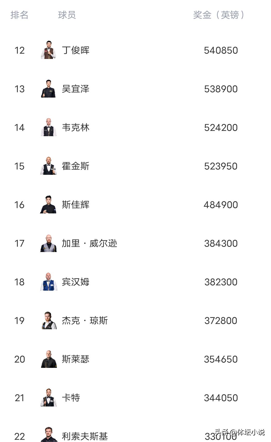 Các tay chơi khác thay đổi thứ hạng không nhiều, O'Sullivan do lâu không giành chức vô địch giải đấu nên thứ hạng liên tục giảm xuống vị trí 11, Trung Quốc vẫn có 5 người nằm trong top 16, Zhao Xintong là người cao nhất đứng thứ tám, Ding Junhui thứ 12, tân vô địch giải Scotland Wakelin vươn lên vị trí 14!