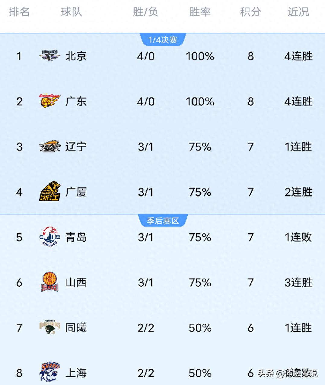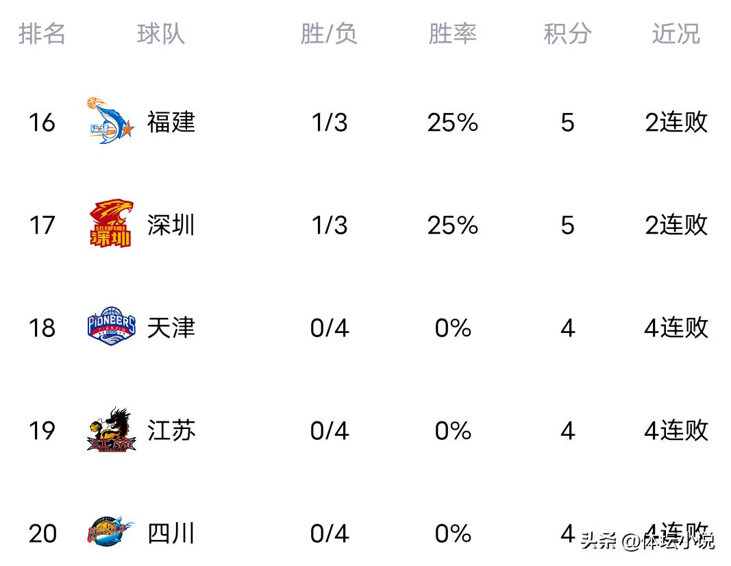 Vào lúc giờ Bắc Kinh ngày 22 tháng 12, giải đấu CBA tiếp tục diễn ra, đêm qua kết thúc 4 trận đấu, trong đó Quảng Đông thắng sát nút Thanh Đảo 89-80, nối dài chuỗi thắng lên 4 trận, Giang Tô thua sát nút Quảng Châu 86-93, nhận chuỗi thua 4 trận liên tiếp, Thiên Tân bị Sơn Tây lội ngược dòng 92-99, đương kim vô địch Quảng Hạ chịu áp lực nhưng vẫn thắng Thượng Hải 97-90, như vậy bảng điểm mới nhất đã được cập nhật, Bắc Kinh vượt qua Quảng Đông đang có 4 trận thắng liên tiếp để đứng đầu, Quảng Hạ đứng thứ tư, Sơn Tây thứ năm, Giang Tô với 4 trận thua liên tiếp đứng thứ 19!
