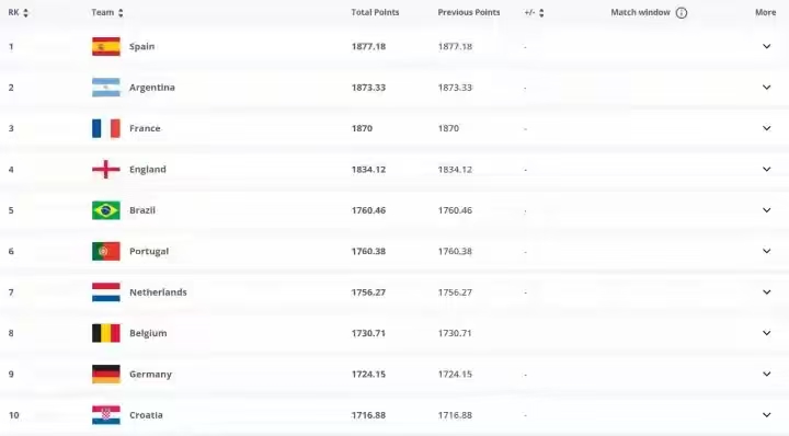 FIFA công bố bảng xếp hạng cuối năm 2025 của các đội tuyển quốc gia, Tây Ban Nha vô địch châu Âu và Argentina vô địch châu Mỹ đứng hai vị trí đầu, Pháp thứ ba, Anh thứ tư, đội châu Phi cao nhất là Morocco đứng thứ mười một, đội châu Á cao nhất là Nhật Bản đứng thứ mười tám.