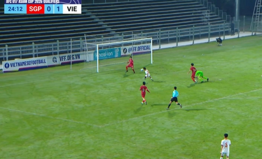 Sỹ Bách xoay xở tốt trong vòng vây hàng thủ Singapore trước khi tung cú dứt điểm đập chân 1 hậu vệ đối thủ, khiến bóng đổi hướng chạm cột dọc khung thành.