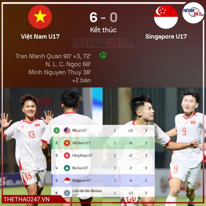 Dù vậy, đội vẫn kịp có thêm bàn thắng thứ sáu ở phút 88, khi hàng thủ Singapore mắc sai lầm nghiêm trọng để Mạnh Quân cướp bóng và dễ dàng sút vào gôn trống. Trận đấu kết thúc với tỷ số 6-0 chung cuộc nghiêng về U17 Việt Nam.