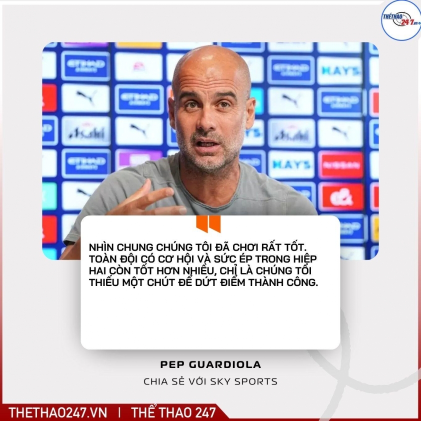 “Một trận đấu sít sao, nhiều cơ hội và hấp dẫn. Nhưng cuối cùng họ ghi hai bàn và họ thắng. Nhìn chung chúng tôi đã chơi rất tốt. Toàn đội có cơ hội và sức ép trong hiệp hai còn tốt hơn nhiều, chỉ là chúng tôi thiếu một chút để dứt điểm thành công,” Pep Guardiola chia sẻ.