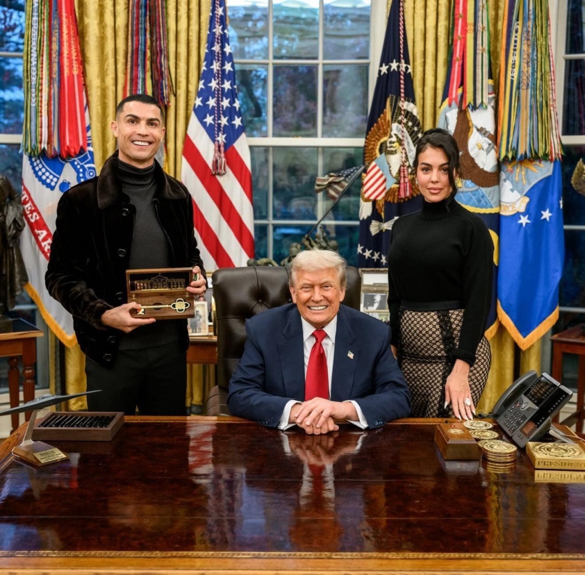 Đầu tuần này, Ronaldo và vị hôn thê Georgina Rodriguez đã tới Washington D.C. để gặp Donald Trump. Cặp đôi tham dự bữa tiệc tối trang trọng cùng nhiều lãnh đạo quyền lực toàn cầu vào tối thứ 3. Cả ba thậm chí còn được bắt gặp vui vẻ trò chuyện khi đi dạo sau sự kiện, trước khi Ronaldo và Georgina được mời vào Phòng Bầu Dục.